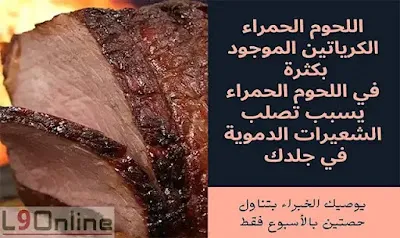 يوصيك الخبراء بتناول حصتين بالأسبوع فقط، لان الكرياتين الموجود بكثرة في اللحوم الحمراء يسبب تصلب الشعيرات الدموية في جلدك، بالتالي ستجد خطوطاً كثيرة تحت عينك وعلى جبهتك بطعم الباربي كيو، إن كنت تستهلك اللحوم الحمراء في كل يوم.