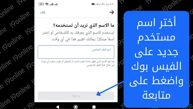 الخطوة الرابعة: هنا يظهر لك اسم المستخدم الجديد الخاص بك الذي يجب أن تكتبه ضمن المستطيل الظاهر أمامك، وبعد كتابته اضغط على (متابعة).