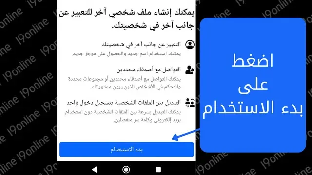 الخطوة الثالثة: ستظهر لك تعليمات عن ما يمكنك أن تفعله بملفك الشخصي الثاني هو أن تعبر عن جانب آخر من شخصيتك، وتضيف الأصدقاء الجدد، والتبديل بين ملفاتك الشخصية الجديدة والقديمة بسهولة، بعد قراءتها اضغط على زر (بدء الاستخدام).