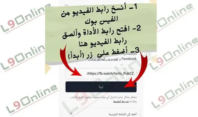 1- أذهب إلى أداةمساعدة (Save The Video) وقم بلصق رابط فيديو الفيس بوك الذي نسخته، وقم بالضغط على زر أبدأ.