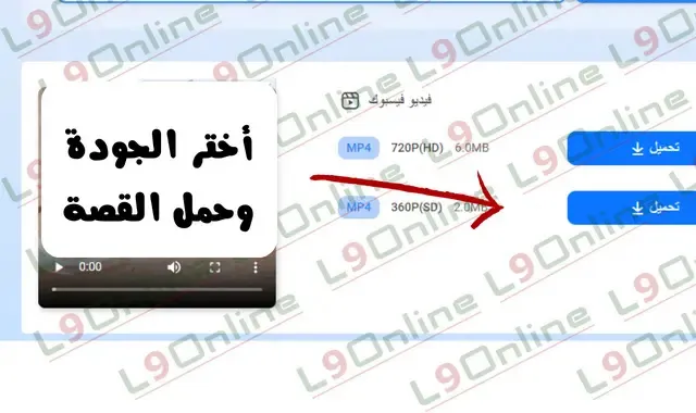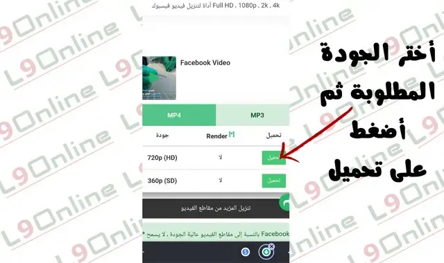 4- حدد جودة فيديو الفيسبوك وأضغط على (تحميل) بجوار الجودة التي أخترتها.