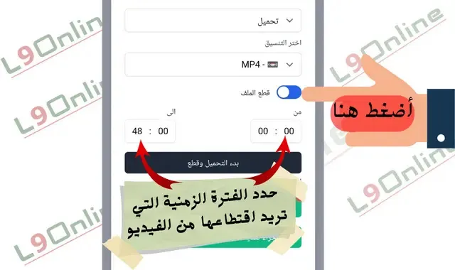 لقص جزء من فيديو الفيسبوك وتحميله الى جهازك فقط فعل خيار (قطع الملف) وحدد فترةزمنية الفيديو الذي تريد قصه من خلال عداد الوقت مثلا: (من الثانية 14 إلى الثانية 50) واضغط بعدها على زر (بدء التحميل وقطع) كما هو موضح في الصورة.