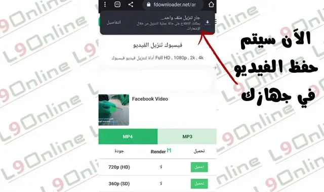 4- انتظر ثواني قليلة ليتم تحميل فيديو الفيس بوك وحفظهُ في جهازك.