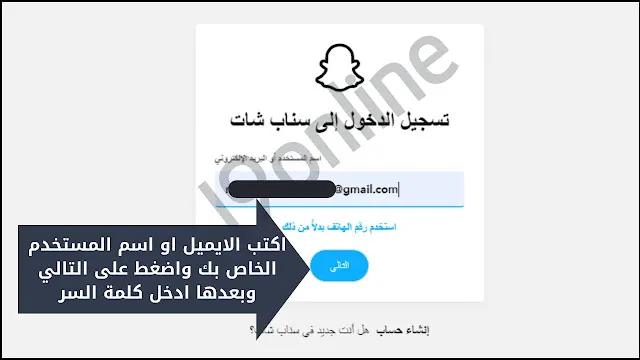 2: تستطيع فتح سناب شات في قوقل بنفس الايميل وكلمة السر لحساب السناب الذي تستخدمه على هاتفك. أو إن أحببت يمكنك انشاء حساب سناب شات للكمبيوتر جديد كليًا. أنظر الصورة التوضيحية التالية.